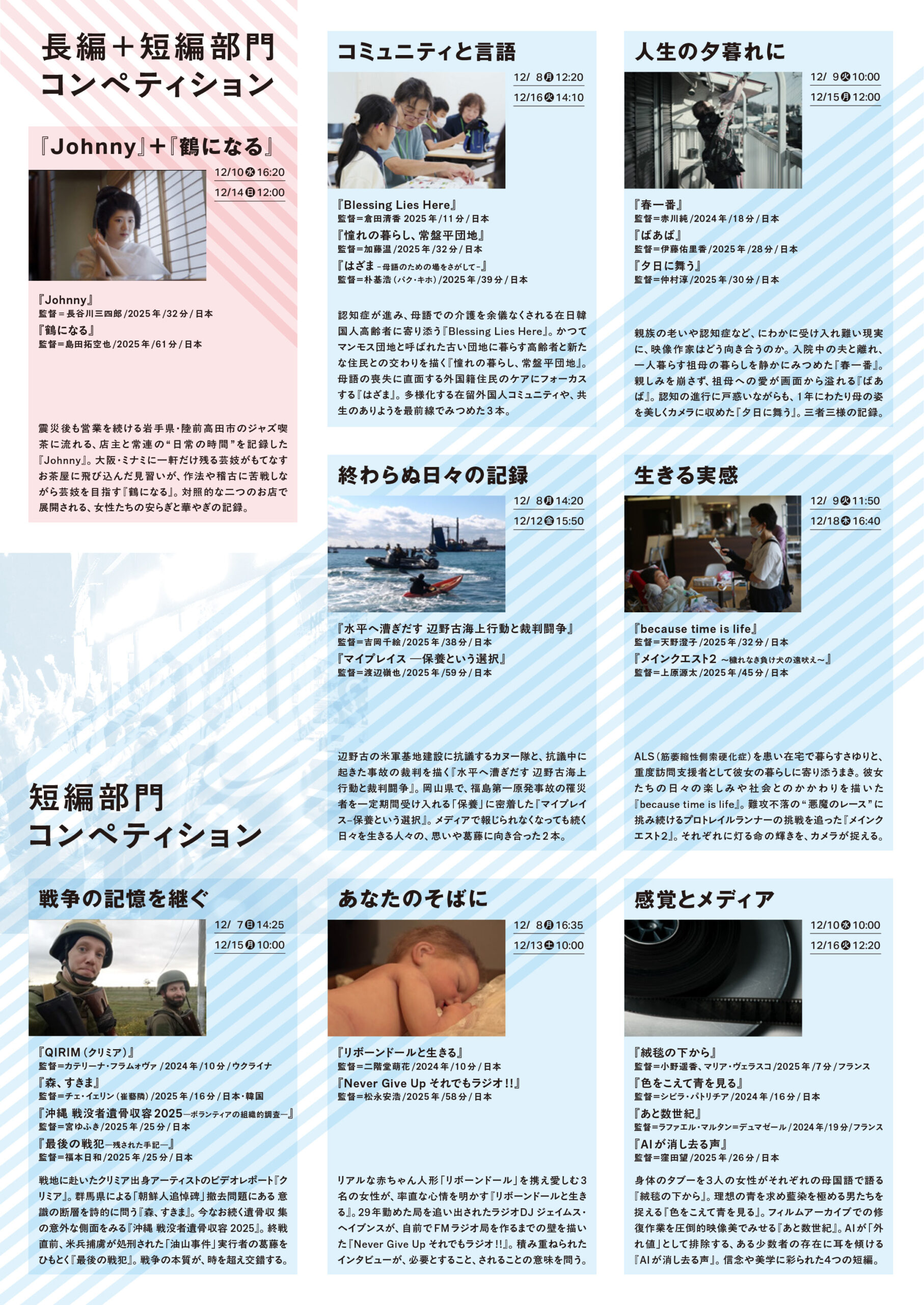 認知症が進み、母語での介護を余儀なくされる在日韓国人高齢者に寄り添う『Blessing Lies Here』。かつてマンモス団地と呼ばれた古い団地に暮らす高齢者と新たな住民との交わりを描く『憧れの暮らし、常盤平団地』。母語の喪失に直面する外国籍住民のケアにフォーカスする『はざま』。多様化する在留外国人コミュニティや、共生のありようを最前線でみつめた3本。